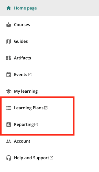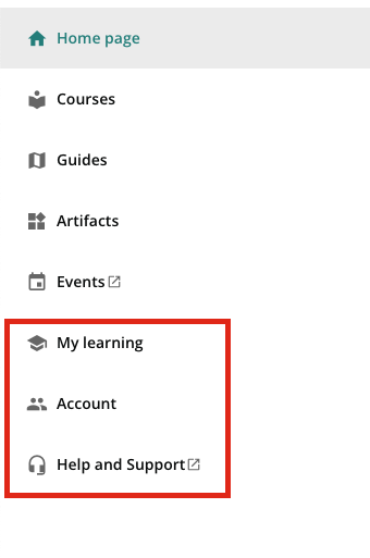 The left-hand sidebar will include familiar pages such as Home page - Default (equivalent of your Home Dashboard), Courses, Events, Guides and Artifacts.