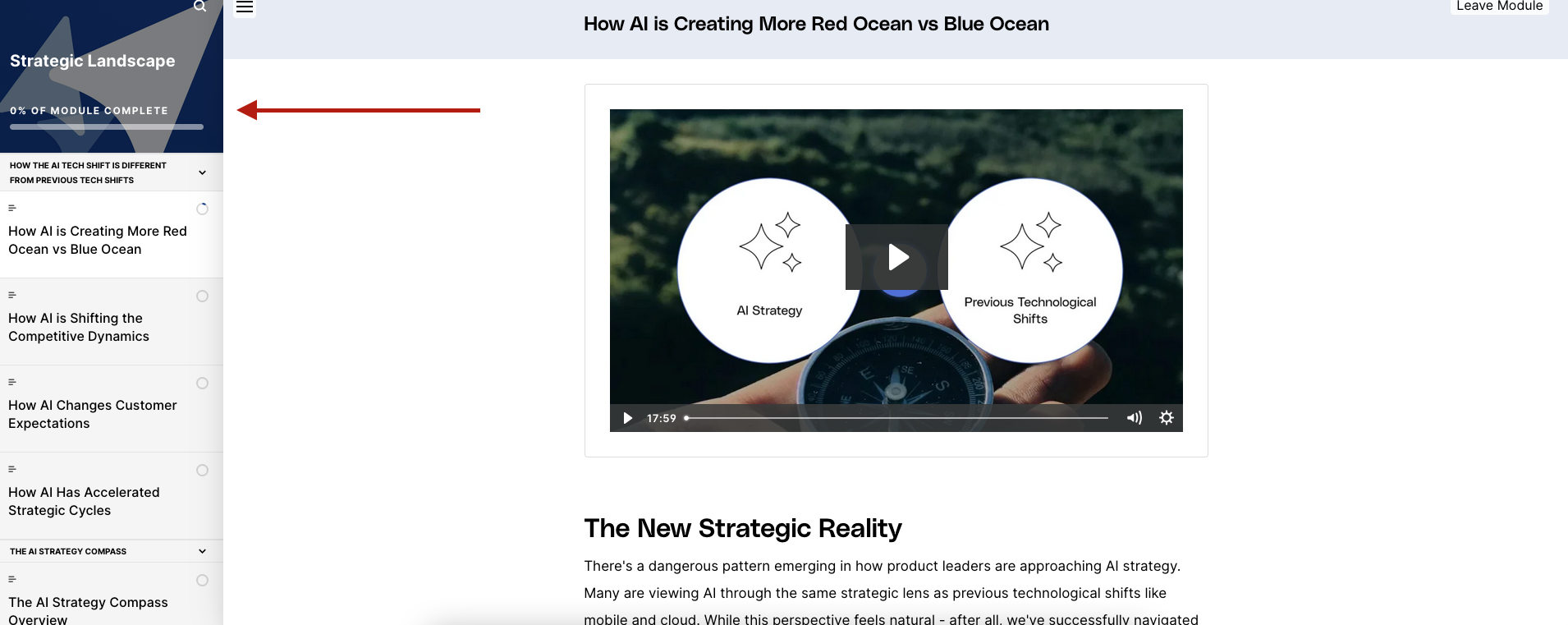Upon entering the module, a module completion bar will appear on the left-hand side of your screen, accompanied by a clickable list of lessons within the module.