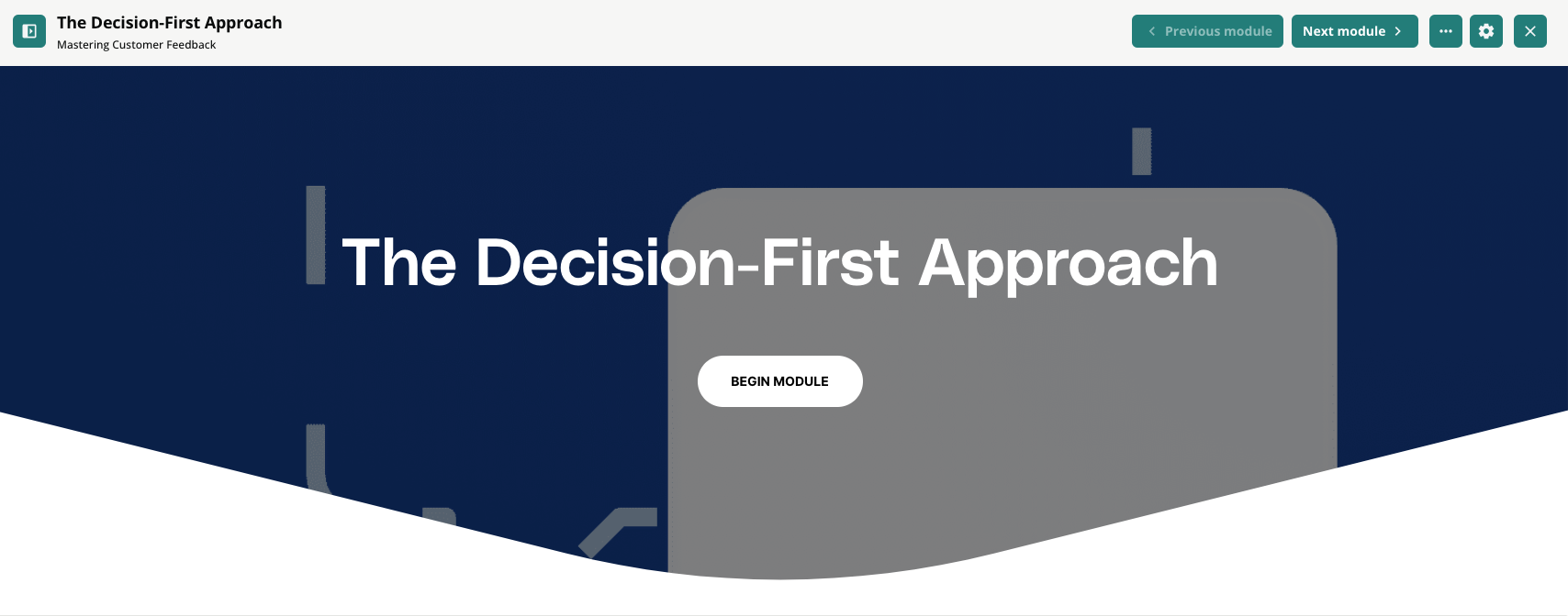 Your Course Navigation will now live at the top of your screen with buttons to toggle to both the previous & next module. You will begin each module by clicking the "Begin Module" button.