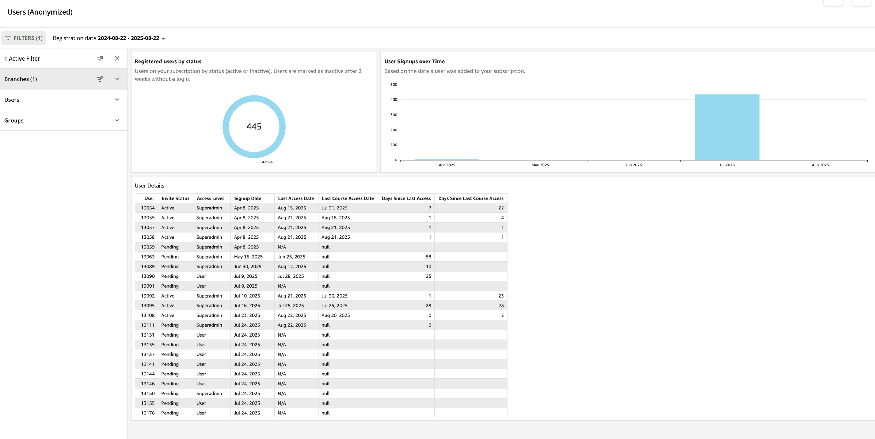 Filter Options: User, Group, Registration Date (user creation date)