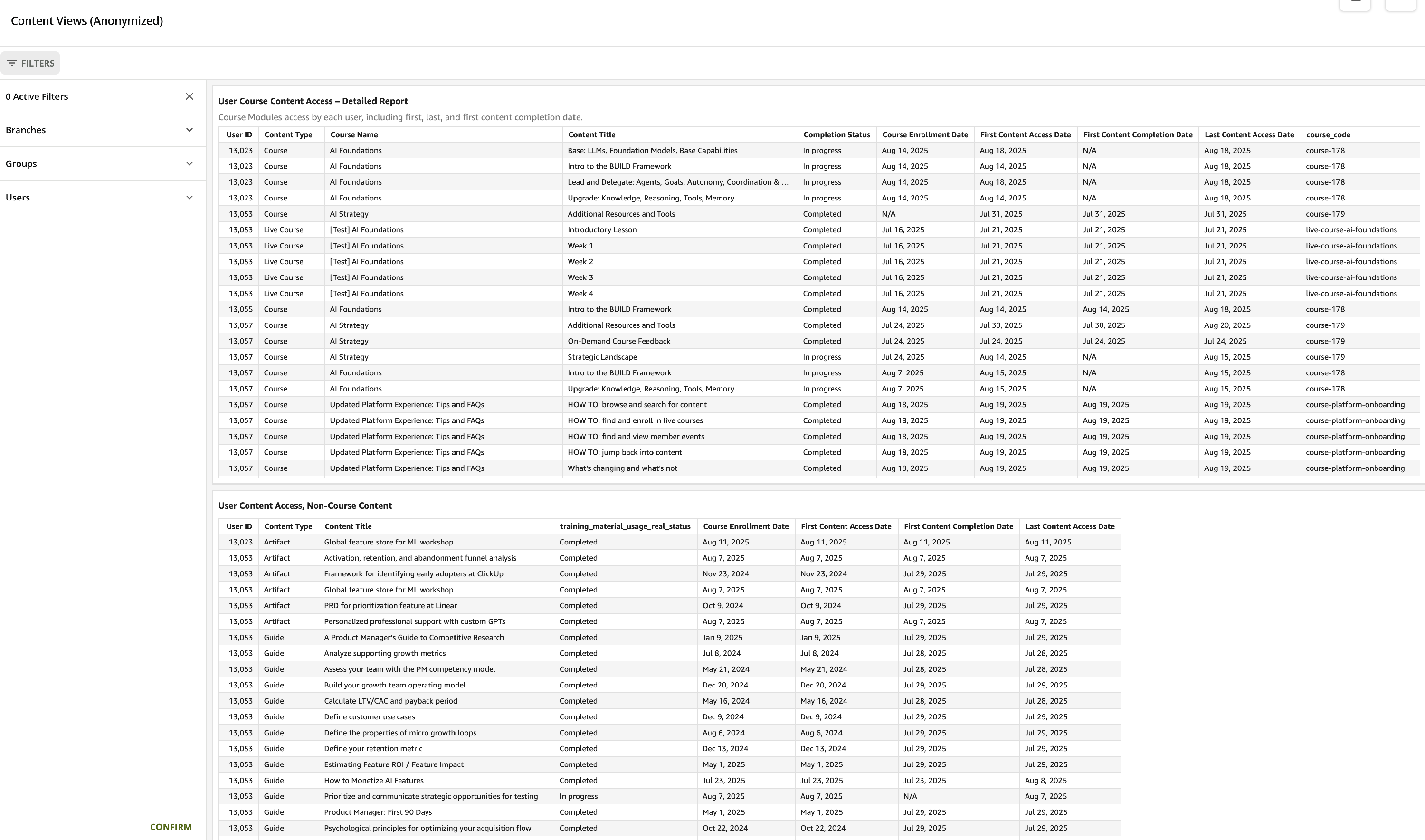 Content views will provide a report containing one record per user + content, with first + last engagement dates and completion status
