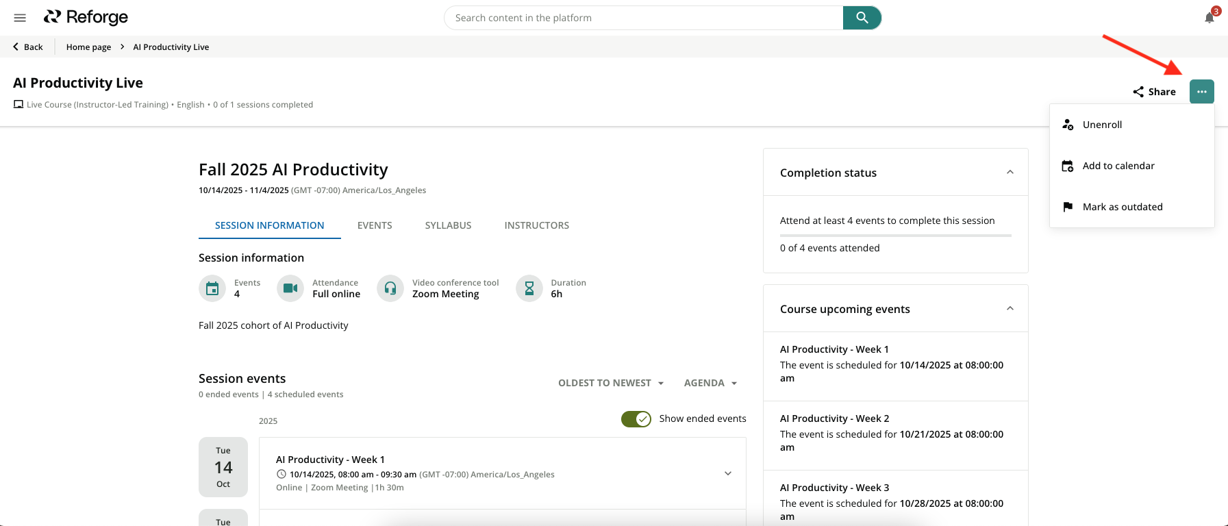 To unenroll from your live course, you'll want to first select & navigate to the course in which you are actively enrolled. Then click the three dot menu in the upper right hand side of the course.