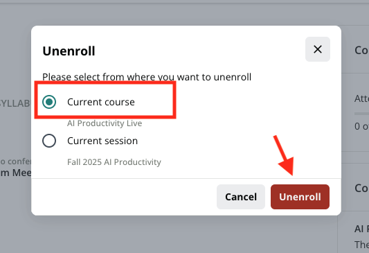 This will generate a pop-up asking if you'd like to unenroll from the course or the session.